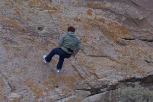 When we arrived, I looked at the 30 foot rock the three rappelling ropes were dangling off. I decided I didn’t have the energy to make my way to the top of the cliff – which is a feat in itself. Also, it seemed every choice I made that day had turned out poorly and I didn’t want to tempt fate by dangling on a rope 30 feet off the ground. Besides, this activity was for the youth. I would stay on the bottom and be a cheerleader/photographer of the girls as they descended.