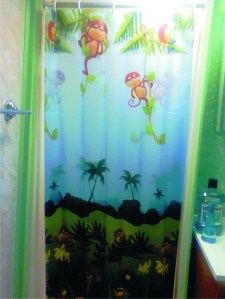 I haven’t had the best of luck with shower curtains. The last one I picked out because I thought it was a “Unique Green” at the store. When I got it home and hung it, I realized it was more of a “Puke Green.” That shower curtain made me sick every time I looked at it for at least the first week. Due to my fiscally retentive nature however, it hung for a few years. If I was able to live with my sickly green curtain, I will learn to put up with my monkey audience. After all, it cost me a whopping $11.96.