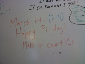 I went to work determined to make my cleverness noticed. “Happy Pi Day,” I wrote on the dry erase board behind me. “Make it count!” Nobody appreciated it.