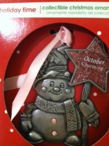Which snowman to get? None were that cute. The last few years I’ve found a better selection at Kmart. But I thought I’d finish my holiday section excursion anyway. On the end of the last aisle I found more snowmen. Not the plush kind that I usually get. These were ornaments to hang on the tree. And they included birthstones. I went through them and instinctively looked for October. Apparently October is a popular birth month because it took some digging. It was only after I found one that I realized what I did. My birth month is August. Her birth month is October. Which one should I get?