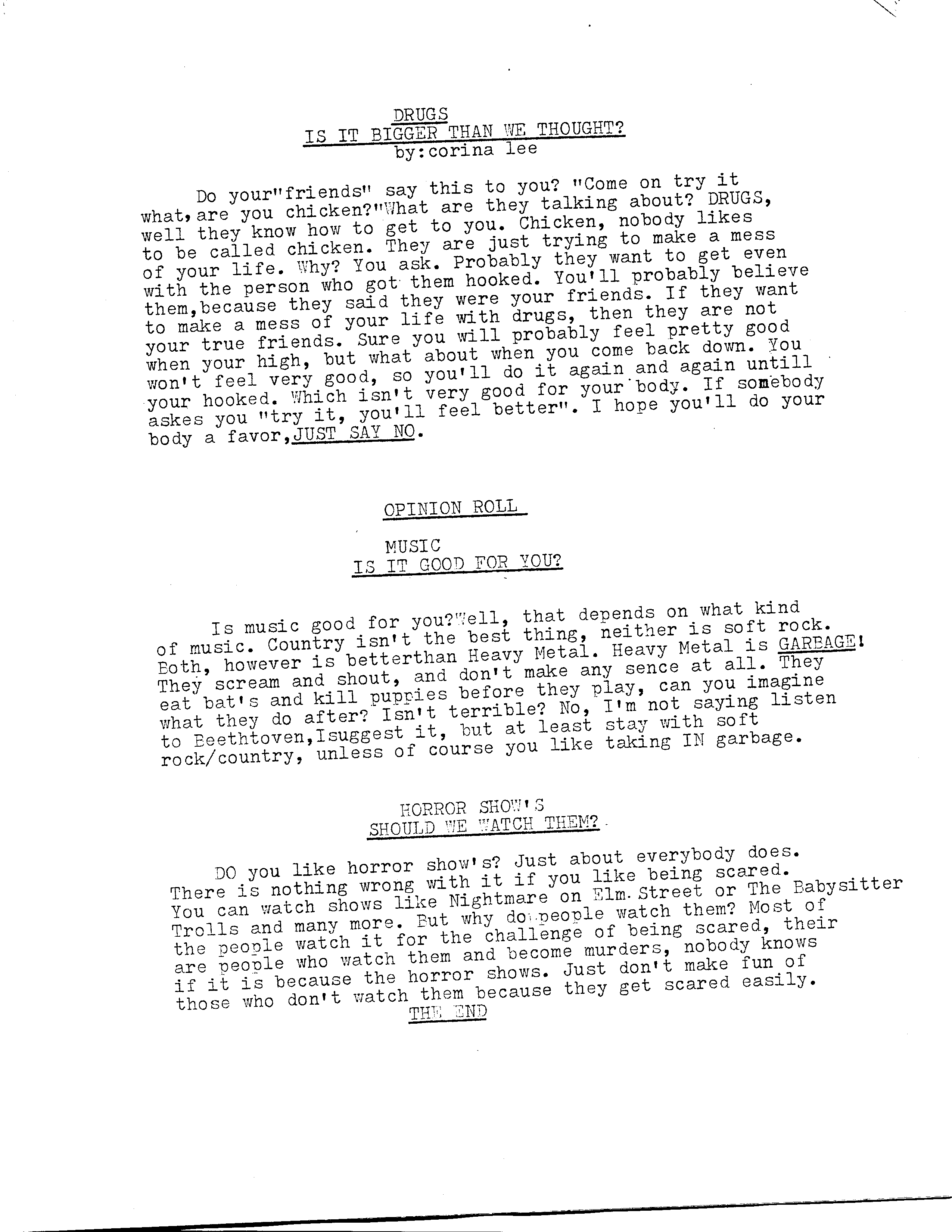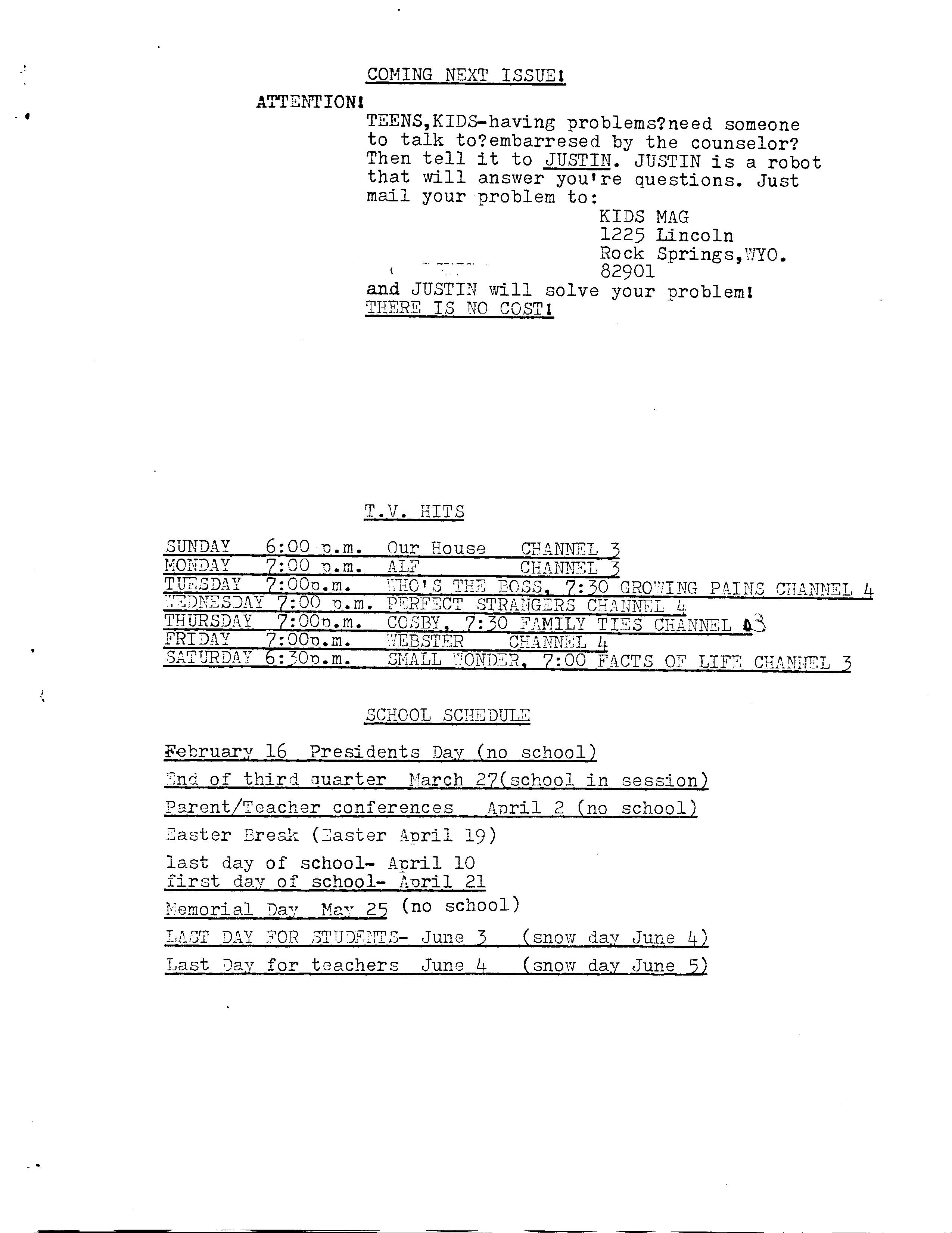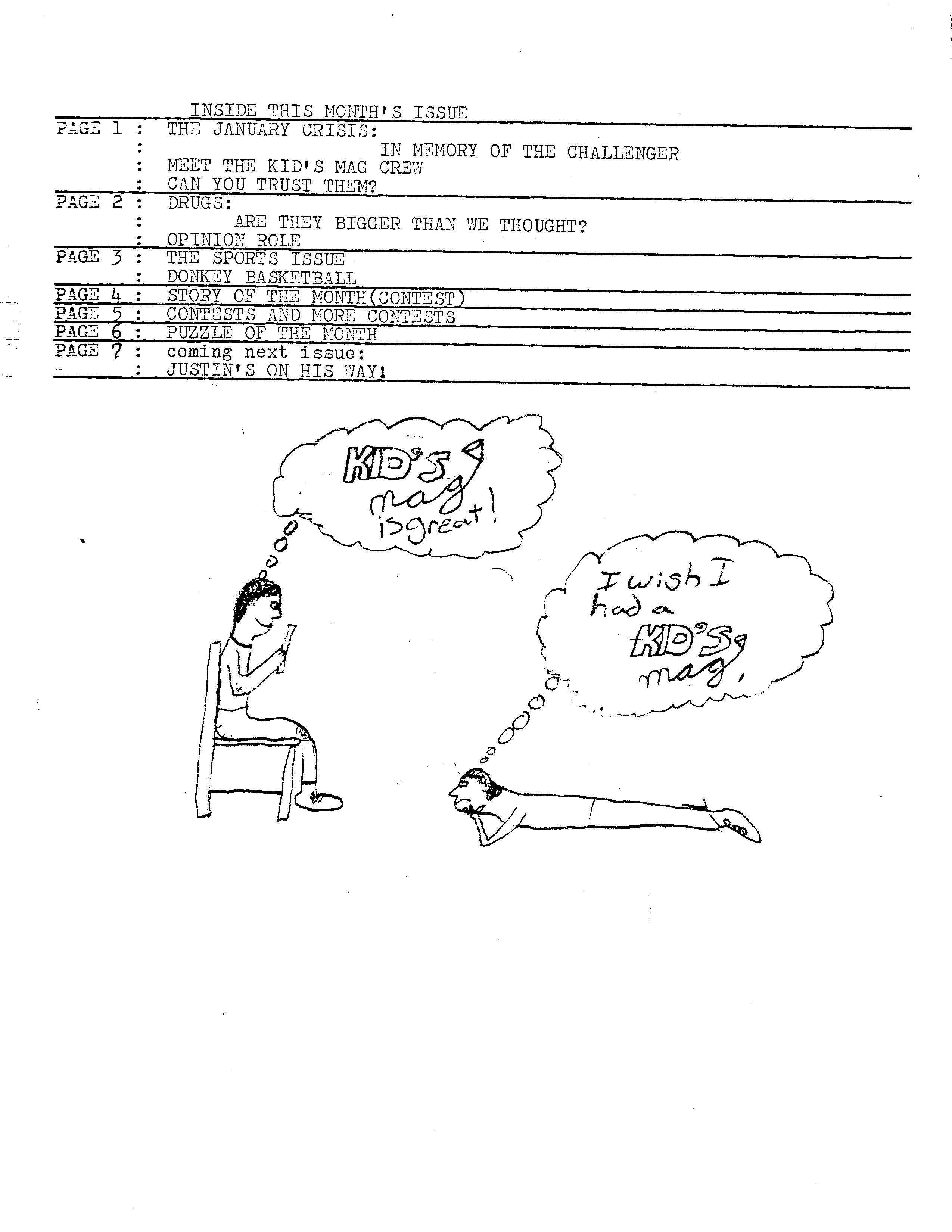 I found the very first issue of Kid’s Mag (in with my mom’s stuff) for you to enjoy. Okay, enjoy might be a strong word. Unfortunately, the date is in the corner. I hoped to discover this all took place at a younger age. But no, I was thirteen. Oh dear. This is a fine token of the educational system at work.