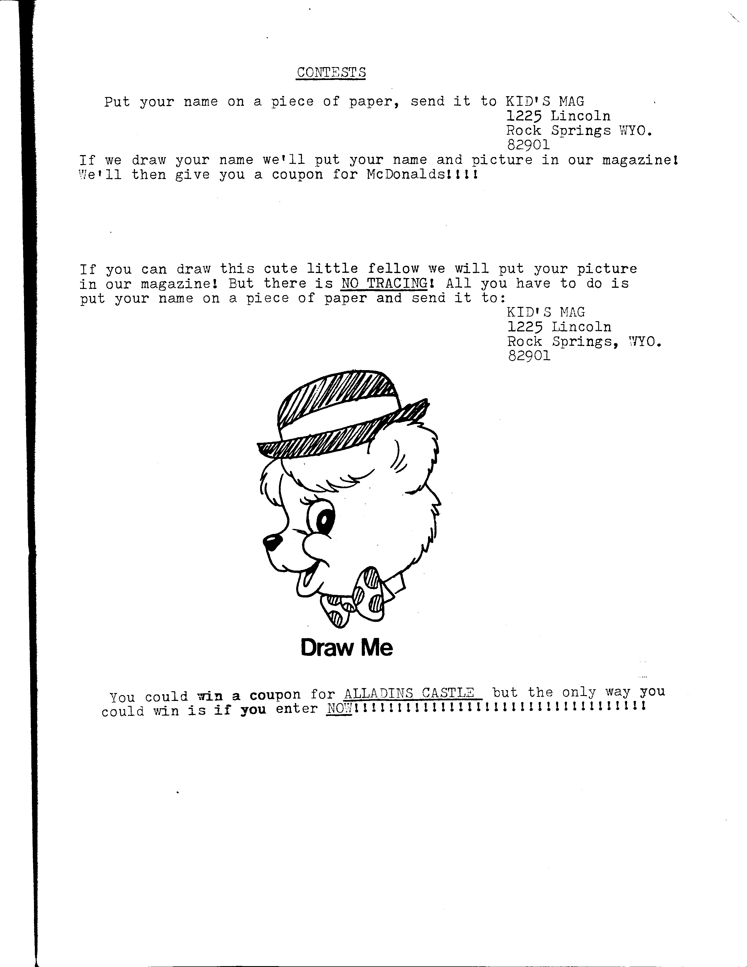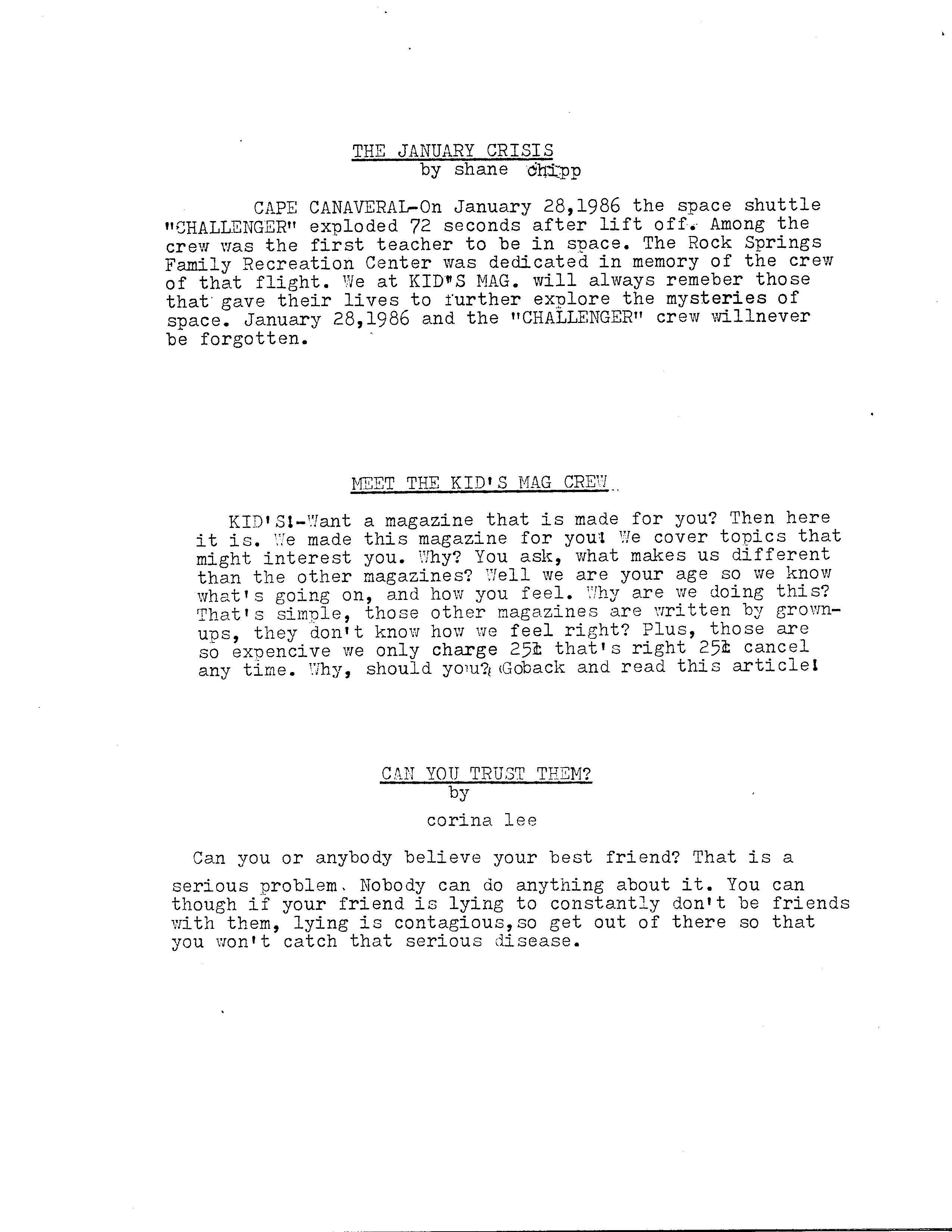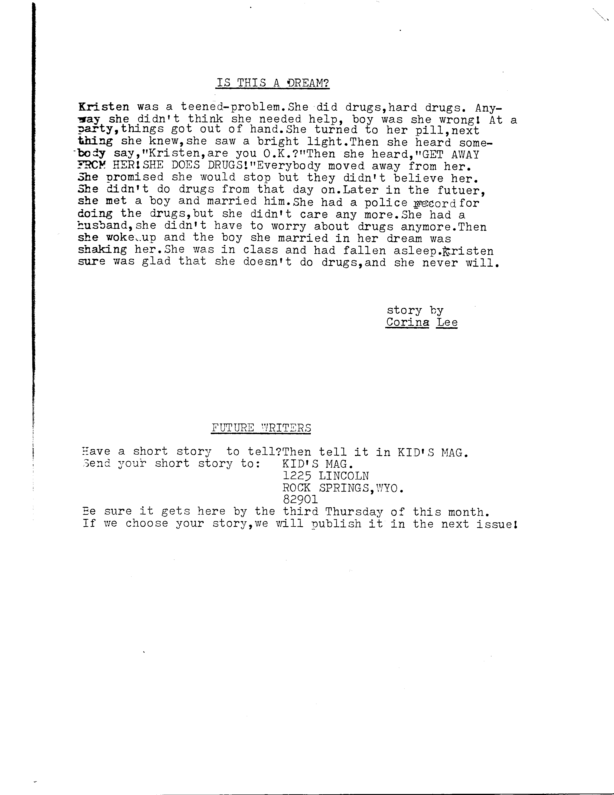 We decided to produce a magazine to keep us busy. In early 1987, Kid’s Mag was born. Our little magazine only cost a quarter to buy. It cost $.90 to produce (we had to make copies at the library). So yes, we folded rather quickly. We did it all on typewriter with a third partner, Susie. Our subscriber pool consisted mainly our moms, nach.