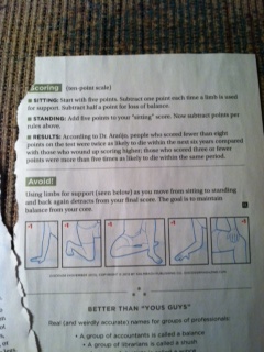 Basically what you do is sit on the floor without losing your balance or using your limbs. You sit straight down and get 5 points. Then you have to stand straight up without using your limbs. If you succeed, you get 5 more points. But if you lose your balance, you lose a half-a-point. If you have to use a limb you lose one point – per limb.