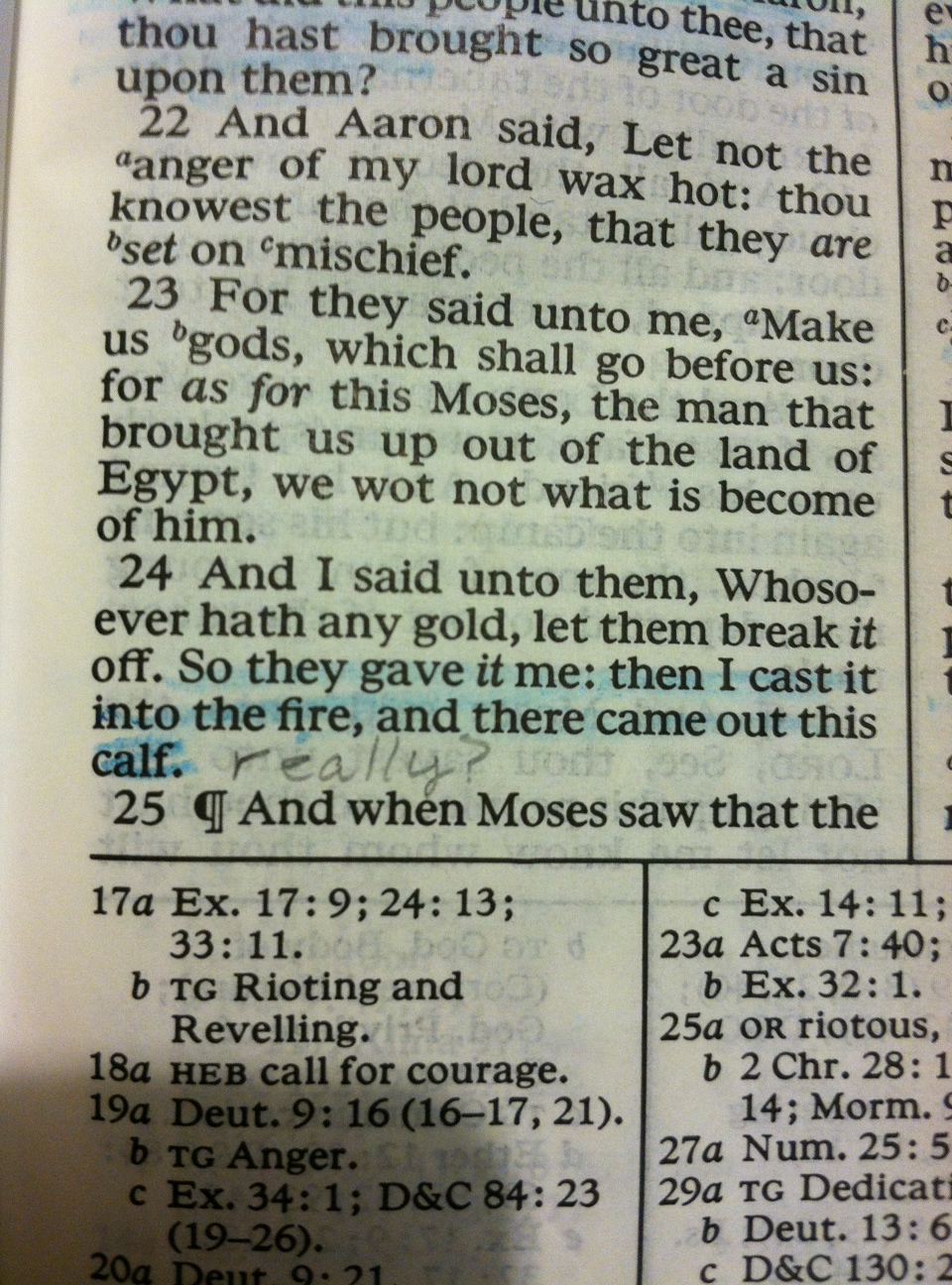I am using mom’s last set of scriptures to read the Sunday School lessons in church. This year we are reading the Old Testament. This is her note in Exodus 32 (you can see how awesome my mom was 🙂 :