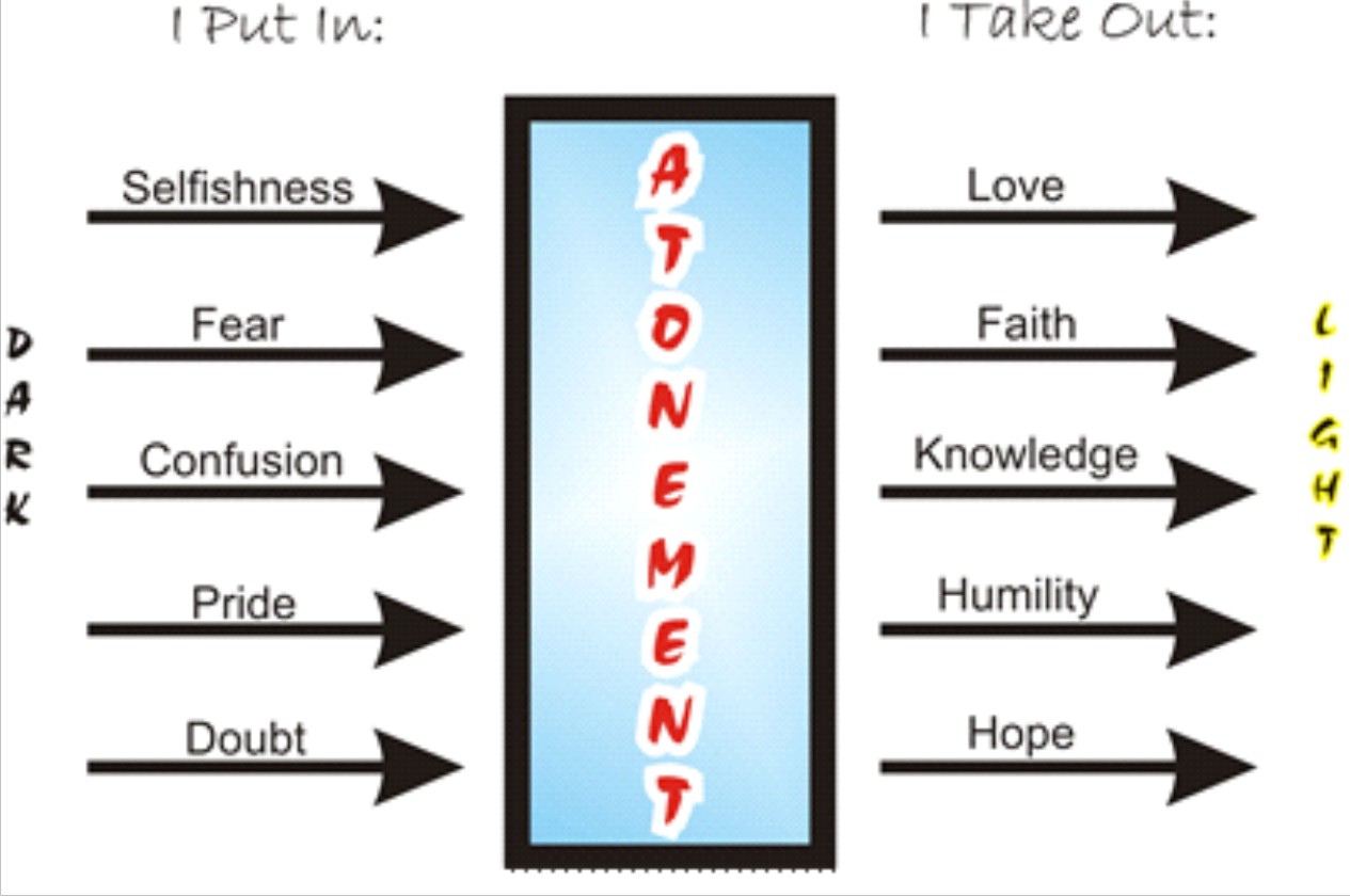 I view the Atonement as an in/out machine. We deposit our selfishness, fear, confusion, pride, and doubt. Because of the Savior, we are able to withdraw love, faith, knowledge, humility, and hope. Basically, we have darkness or the things of the world to offer. In return, we get light and the things of eternity offered to us.