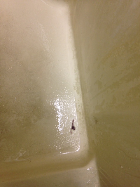 I couldn’t decide. The shower is a little too small to allow me to take a closer look right then. I did the best I could do without glasses and without getting within inches of it. Just don’t touch it, I told myself.