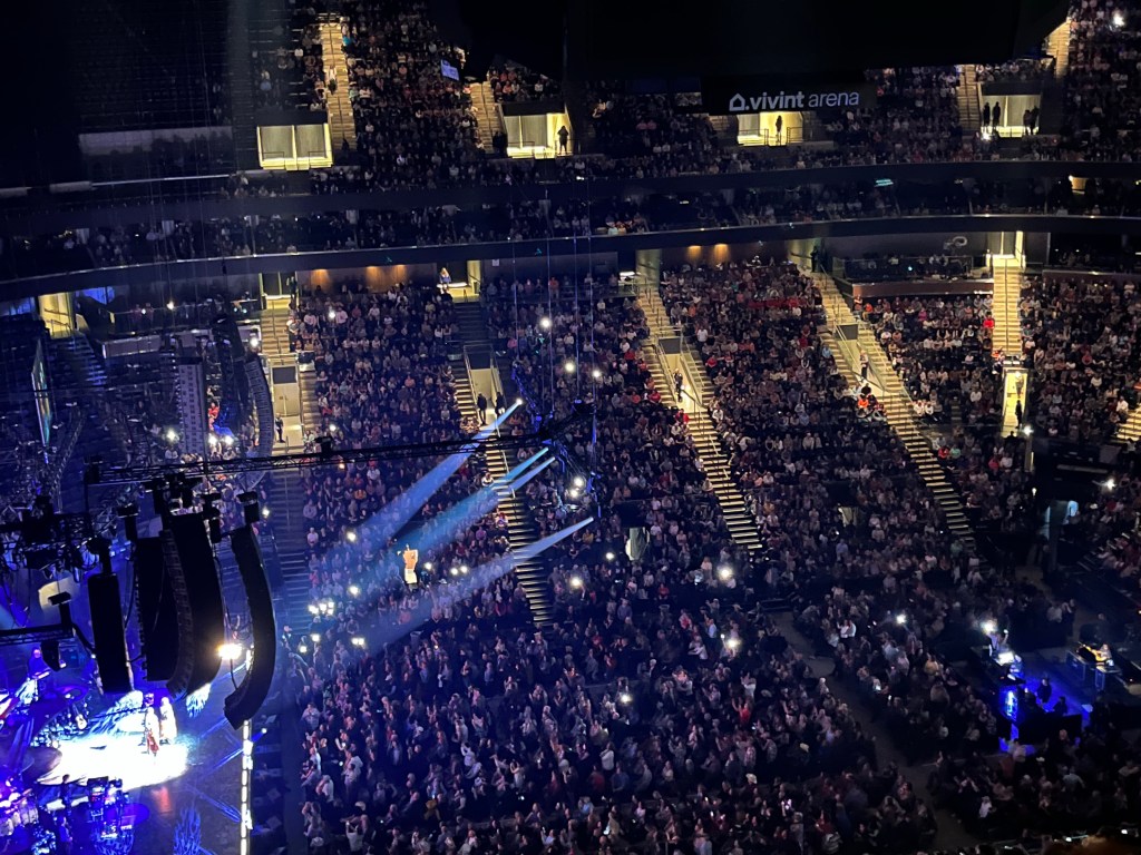 We arrived at the venue and I was disappointed with our seats. I knew we were going to be up there but I thought we were in the lower of the upper tier. We were in the upper of the upper. And on the side. The view from my seat a duct actually blocked the view of the singer’s head. Also, we were so far up that most of the banter between songs sounded like Charlie Brown’s teacher. That’s why I am always wary of attending concerts in the Vivint Arena. There is a threshold of good sound and they sell tickets past that threshold. We were past that threshold.